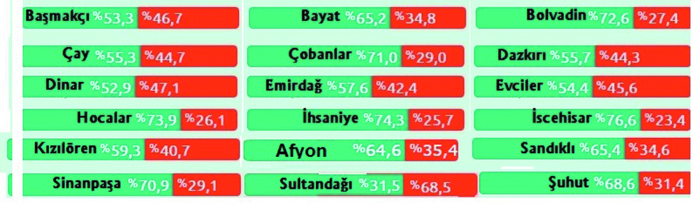 Merkez ilçe dahil 18 ilçenin yalnızca birisinde, Sultandağı’nda halkın yüzde 68’i hayır oyu kullanırken, en yüksek evet oyu yüzde 75,9’la İscehisar’dan çıktı. Orman ve Su İşleri Bakanı Prof. Dr. Veysel Eroğlu’nun memleketi Şuhut’tan yüzde 68,8 evet çıktı.