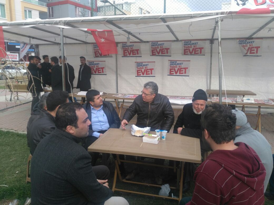 KURTULUŞ-Cumhuriyet Halk Partisi İl Başkanı Kemal Demirkırkan ile CHP Merkez İlçe Başkanı Yusuf Onur Seçme, "Evet" çadırını ziyaret ederek referandum sürecinin barış içinde sonuca ereceği mesajı verdi.