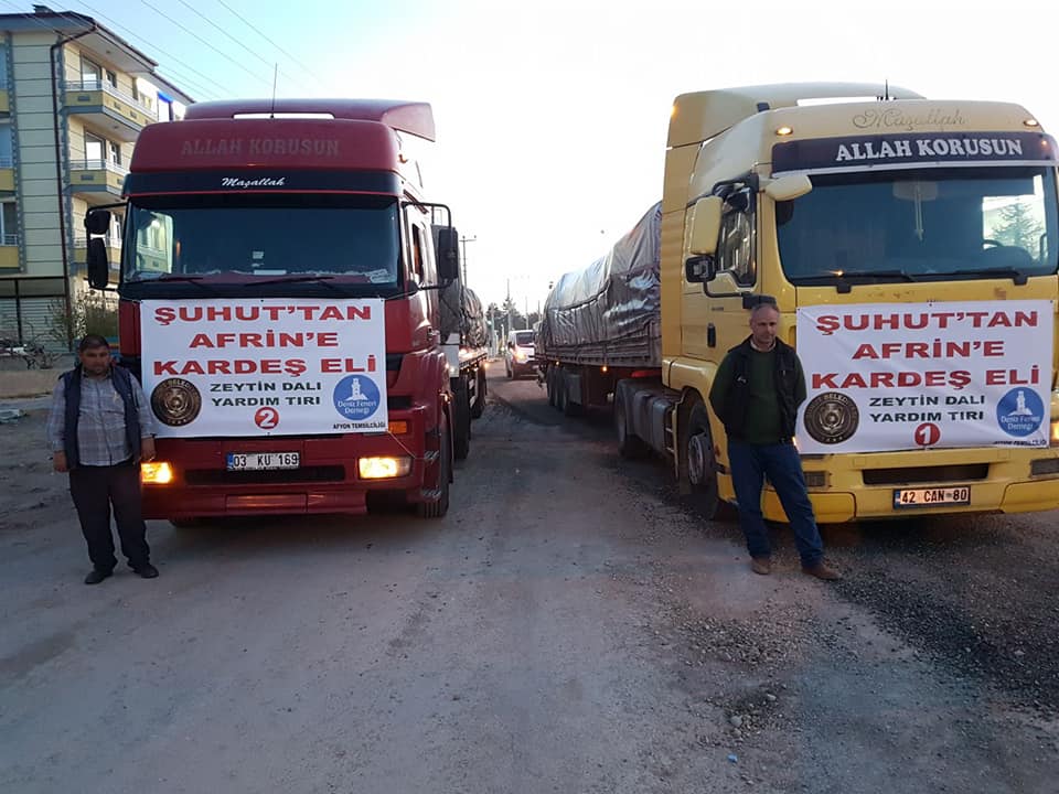 Şuhut Belediyesi ve hayırsever halkının bağışladığı 2 tır Şuhut Patetesi , Afrin halkına ulaştırmak üzere 4 Nisan 2018 saat 19:00 sularında Şuhut’tan Afrin’e doğru yola çıktı