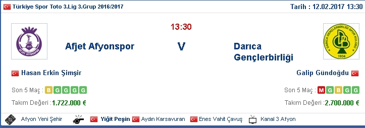 Türkiye Spor Toto 3. Lig 3. Grup’ta şampiyonluk savaşı veren lider Afjet Afyonspor, yarın lig ikincisi Darıca gençler Birliği’ni ağırlayacak. Üçüncü ligde haftanın maçı olarak gösterilen karşılaşma Atatürk Stadyumu’nda (Afyon Yeni Şehir) saat 13.30’da başlayacak. Maçı Yiğit Peşin, Aydın Karsavuran, Enes Vahit Çavuş üçlüsü yönetecek. ●İsteniş Hakan Tüplek