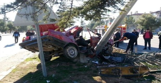 Dinar’da elektrik direğine çarpan otomobili ortadan ikiye ayrıldı. Kazada 3 kişi yaralandı.