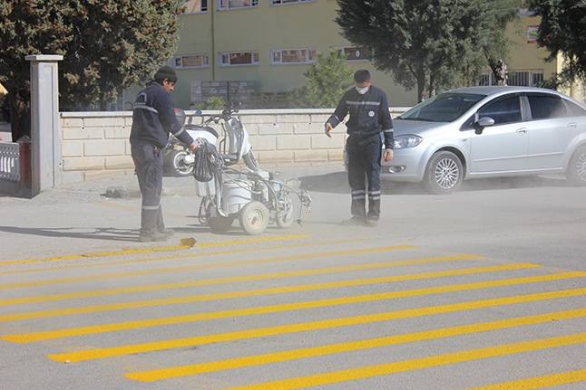 Dinar Belediyesi ekipleri tarafından ilçemizde bulunan okulların giriş önlerine yaya geçit çizgileri boyanıyor.