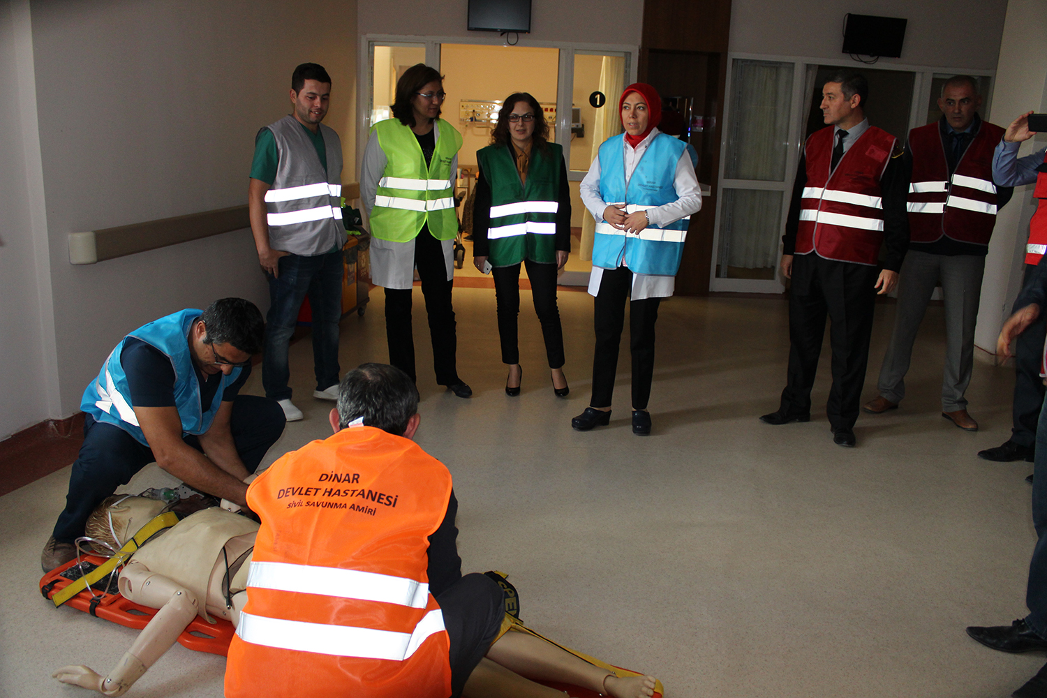 Dinar Devlet Hastanesinde, UMKE tarafından gerçekleştirilen deprem ve yangın tatbikatında, ağır bir deprem ve yangın sonucunda ambulanslar tarafından hastaneye ulaştırılan hastalara müdahale ve hastane içerisinde mahsur kalan hastaları kurtarma senaryoları uygulandı.