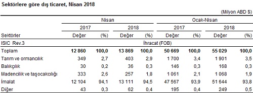 Türkiye İstatistik Kurumu ile Gümrük ve Ticaret Bakanlığı işbirliğiyle oluşturulan geçici dış ticaret verilerine göre; ihracat 2018 yılı Nisan ayında, 2017 yılının aynı ayına göre %7,8 artarak 13 milyar 869 milyon dolar, ithalat %15,6 artarak 20 milyar 554 milyon dolar olarak gerçekleşti.