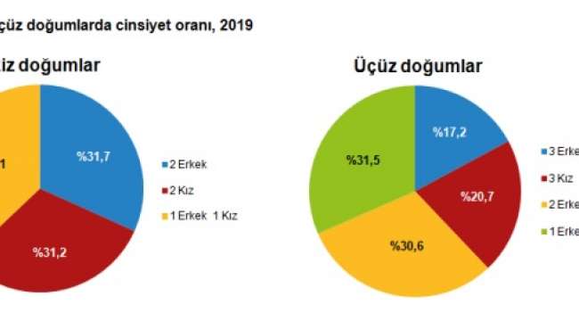 Üçüz doğumların 2019 yılında %31,5'inde bebeklerin biri erkek ikisi kız olurken %30,6'sında bebeklerin ikisi erkek biri kız oldu. Diğer taraftan, üçüz doğumların %20,7'sinde bebeklerin hepsi kız, %17,2'sinde ise bebeklerin hepsi erkek oldu.