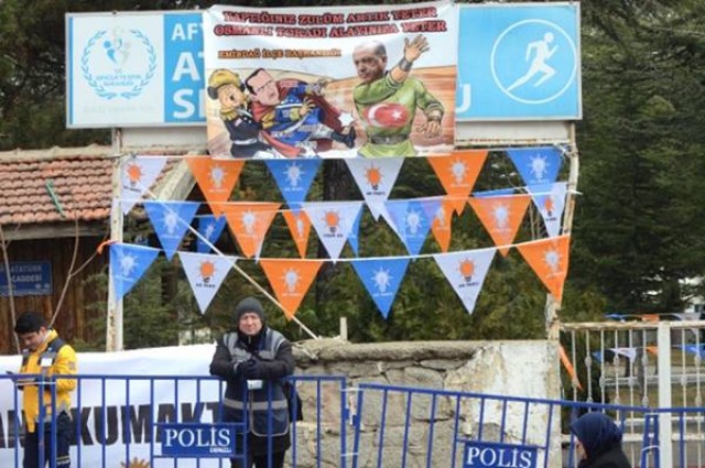 Afyonkarahisar'ı ziyaret etmesi beklenen Cumhurbaşkanı Recep Tayyip Erdoğan'ın konuşma yapacağı alana asılan 'Osmanlı tokadı' temalı pankart büyük ilgi çekti.