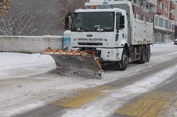 Emirdağ'daki kar yağışı ile çalışmalarına başlayan ekipler, tuzlama ve yol açma çalışmaları gerçekleştiriyor. Karın yağışı ile birlikte karla mücadele çalışmalarında kullanılan araç filosu ile ekipler, ilk olarak ana yollar, otobüs güzergâhları daha sonra sokak aralarında çalışmalar yapıyor. Kepçe ve greyderlerle karlar temizlenirken bir yandan da tuzlama çalışması yapılıyor.