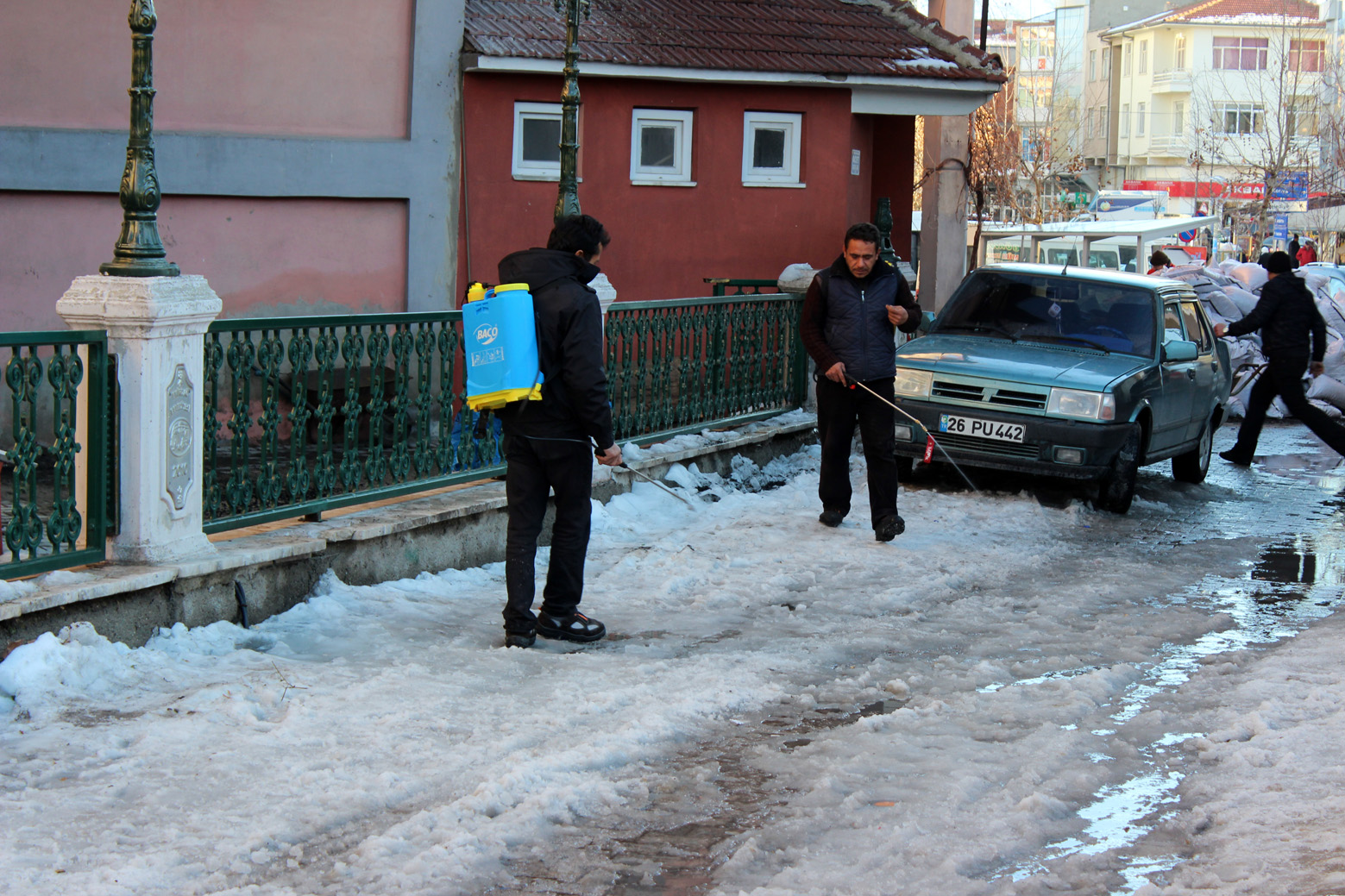 Emirdağ Belediyesi ilçede ağır geçen kış mevsiminin yaşattığı olumsuzluklara karşı mücadelesini sürdürüyor. Belediye çalışanları sokaklardaki buzlanmaya karşı solüsyon ile mücadele ediyor.