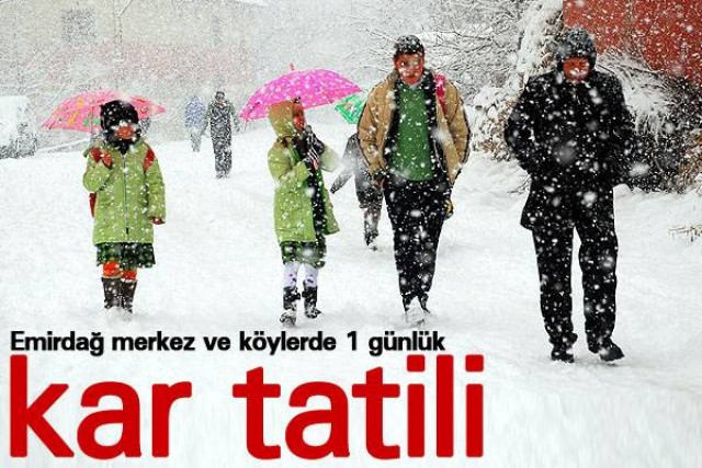 Emirdağ İlçe Kaymakamlığı'ndan yapılan resmi açıklamada, "Yoğun kar yağışı nedeniyle ilçe merkezi ve köylerimizde tüm okullar bir gün sureyle tatil edilmiştir." denildi.
