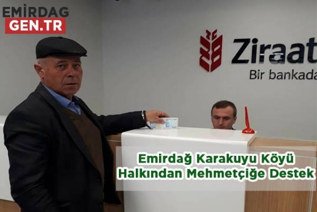 Karakuyu köyünden Mustafa Sezer, salı günü Emirdağ'daki bir banka şubesine giderek Karakuyu köyü halkı adına 2.950 TL'yi Mehmetçik Vakfı'nın hesabına yatırdı. Sezer konuyla ilgili "Afrin de seferde olan mehmetçiğimiz için topladığımız 2950 tl yardımı bugün itibari ile yerine ulaştırdık. Allah yardım edenlerin yardımlarını kabul eylesin. Afrin de sefer de olan mehmetçiğimiz için dualarınızı esirgemeyin." dedi.