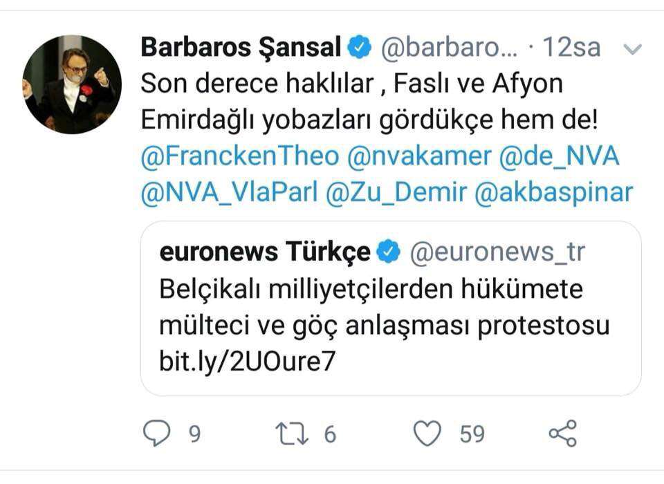 Moda tasarımcısı ve LGBT (Lezbiyen, Gey, Biseksüel ve Transgender) savunucusu olan Barbaras Şansal, Euronews Türkçe'nin Belçika'da Flaman millyetçilerin AB binalarına saldırması, hükümete mülteci ve göç anlaşması konulu haberiyle ilgili olarak yaptığı yorumda; "Son derece haklılar, Faslı ve Afyon Emirdağlı yobazları gördükçe hem de!" diyerek Belçika'nın Yeni Flaman İttifakı Partisi NVA,eski göç bakanı Theo Francken ve Türkiye karşıtı söylemleriyle bilinen, PKK propagandası yapmakla suçlanan Yeni Flaman İttifakı Partisi (N-VA) Milletvekili Zuhal Demir'i de etiketlemesi gözlerden kaçmadı.