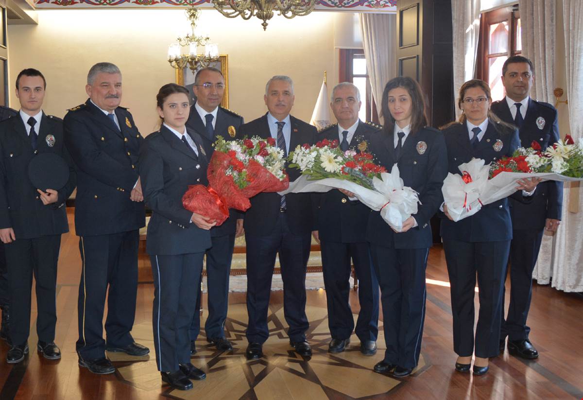 Türk Polis Teşkilatının 172. Kuruluş Yıldönümü ve Polis Haftası nedeniyle İl Emniyet Müdürü Fahrettin Şen, Polis Meslek Eğitim Merkezi Müdürü Vekili Mehmet Er, Polis Moral Eğitim Merkezi Müdürü Şeref Karakaya ve polis memurlarından oluşan bir heyet Vali Aziz Yıldırım’ı makamında ziyaret etti.