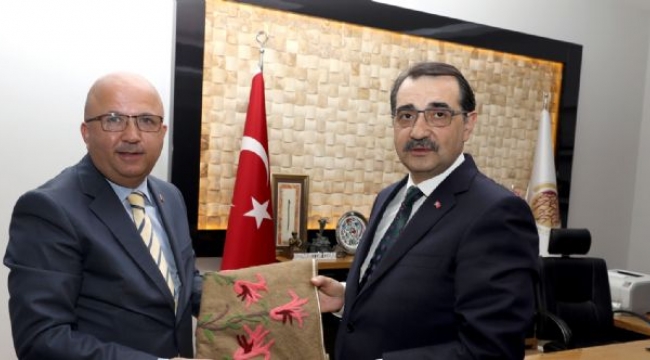 Ziyaretin anısına Başkan Burhanettin Çoban, Enerji ve Tabii Kaynaklar Bakanı Fatih Dönmez’e keçeden yapılmış bir seccade hediye etti.