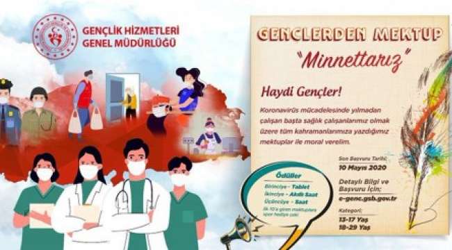 Gençlik ve Spor Bakanlığı, tüm dünyayı etkileyen yeni tip koronavirüs (Kovid-19) ile mücadelede ön saflarda yer alan başta sağlık çalışanları olmak üzere tüm kahramanlara yönelik mektup yarışması düzenliyor.