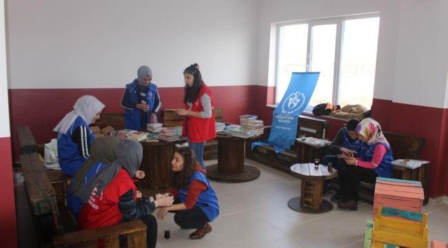 Esnaftan ve marangozlardan toplanan lastik, kasa ve tahtalardan kütüphane için kitaplık, sandalye, masa yapıldı. Gönüllü gençlerimiz tarafından kütüphane renklendirildikten sonra kitaplar yerleştirildi. Okuldaki öğrencilerimiz için zevkle kitap okuyacakları renkli bir ortam oluşturuldu.