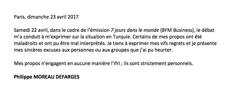 "22 Nisan Cumartesi, 'Dünyada 7 Gün' yayını çerçevesinde (BFM Business), Türkiye'deki duruma ilişkin görüşlerimi ifade etmek için tartışmaya davet edildim. Bazı ifadelerim uygunsuz oldu ve yanlış anlaşıldı. Derin üzüntümü ifade etmek istiyorum ve kırmış olabileceğim kişi ve gruplardan içtenlikle özür diliyorum. Sözlerim hiçbir şekilde IFRI'yi bağlamamaktadır ve tamamıyla kişiseldir."