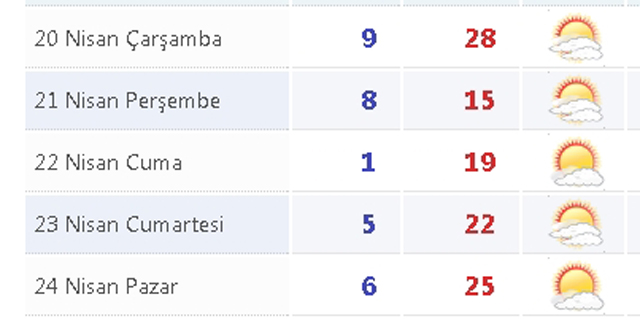 Yağışlı ver serin havanın perşembe günü, Marmara’nın doğusu, Karadeniz, İç Ege (Afyonkarahisar ve Kütahya çevreleri), İç Anadolu ile Doğu Anadolu’nun kuzey ve batısında sağanak ve gök gürültülü sağanak şeklinde etkili olacağı bekleniyor. Serin ve yağışlı havanın cuma gününden itibaren doğuya kayması bekleniyor. Serin ve yağışlı havanın hafta sonundan itibaren tekrar yükseleceği tahmin ediliyor.
