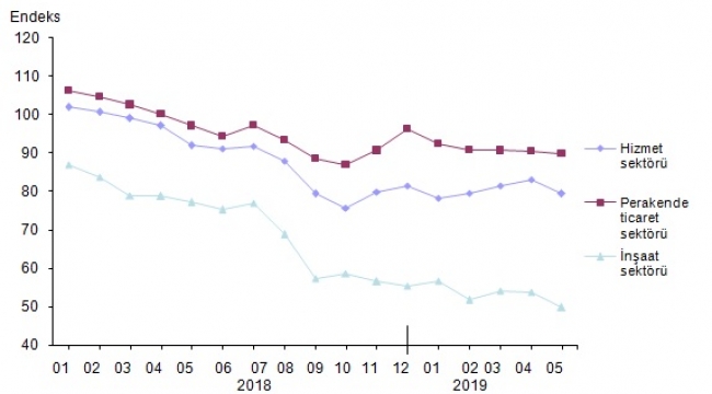 Mevsim etkilerinden arındırılmış hizmet sektörü güven endeksi Nisan ayında 83,1 iken, Mayıs ayında %4,4 oranında azalarak 79,4 oldu. Hizmet sektöründe bir önceki aya göre; iş durumu, hizmetlere olan talep ve hizmetlere olan talep beklentisi endeksleri sırasıyla %4,8, %3,7 ve %4,7 azalarak 75,1, 73,2 ve 90 değerlerini aldı.