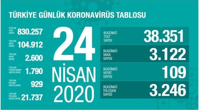 Son 24 saat içinde 38.351 test yapıldı ve 3.122 yeni tanı kondu. 109 kişi hayatını kaybederken 3.246 kişi daha iyileşti.