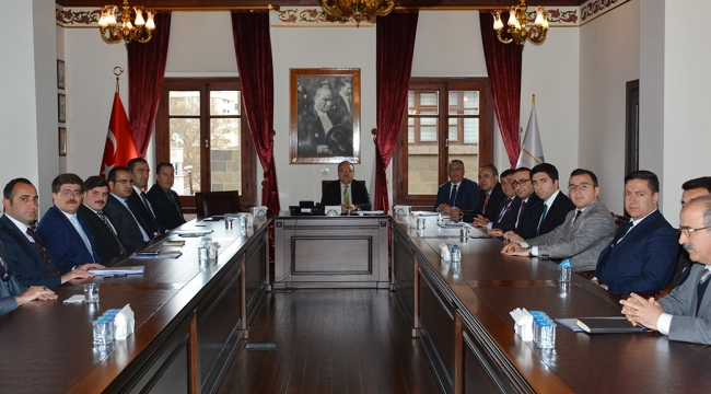 İlçe kaymakamları, Vali Mustafa Tutulmaz’ın başkanlığında Valilik Toplantı Salonunda bir araya geldi. Toplantıya Vali Yardımcısı Mehmet Boztepe ve kaymakamlar katıldı.