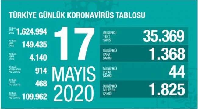 Sağlık Bakanlığından yapılan açıklamaya göre, son 24 saatte 44 kişi korona virüsten hayatını kaybetti, toplam can kaybı ise 4 bin 140 oldu. Bugün toplam 35 bin 369 test yapılırken, bin 368 yeni vaka tanısı konuldu, toplam vaka sayısı ise 149 bin 435 oldu. Bugünkü bin 825 kişiyle ile birlikte toplam iyileşen sayısı da 109 bin 962'e yükseldi. Toplam entübe hasta sayısının 468, toplam yoğun bakım hasta sayısının ise 914 olduğu açıklandı.