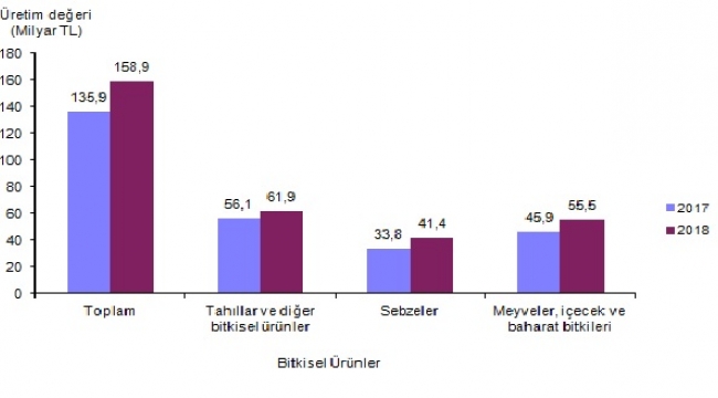 Bitkisel üretim değeri 158,9 milyar TL oldu. Bir önceki yıla göre; tahıllar ve diğer bitkisel ürünler üretim değeri %10,4 artarak 61,9 milyar TL, sebze üretim değeri %22,3 artarak 41,4 milyar TL ve meyveler, içecek ve baharat bitkileri üretim değeri ise %20,9 artarak 55,5 milyar TL oldu.
