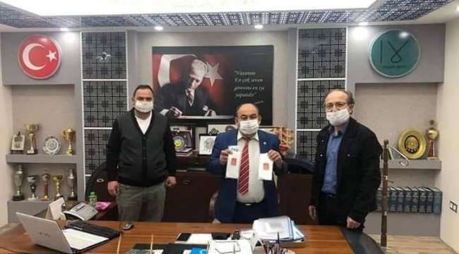 Maskeleri MHP İlçe Başkanı Şaban Çabuk, Döğer Belediye Başkanı Mehmet DEMİREL' e teslim etti.