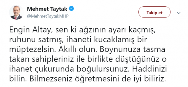 Milliyetçi Hareket Partisi Afyonkarahisar Milletvekili Mehmet Taytak,"Engin Altay, sen ki ağzının ayarı kaçmış, ruhunu satmış, ihaneti kucaklamış bir müptezelsin. Akıllı olun. Boynunuza tasma takan sahipleriniz ile birlikte düştüğünüz o ihanet çukurunda boğulursunuz. Haddinizi bilin. Bilmezseniz öğretmesini de iyi biliriz."dedi.