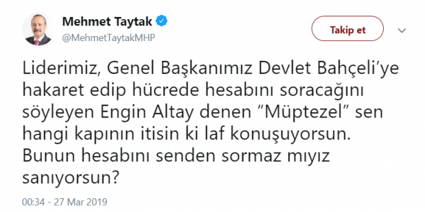Mehmet Taytak'ın açıklamaları şu şekilde: Liderimiz, Genel Başkanımız Devlet Bahçeli’ye hakaret edip hücrede hesabını soracağını söyleyen Engin Altay denen “Müptezel” sen hangi kapının itisin ki laf konuşuyorsun. Bunun hesabını senden sormaz mıyız sanıyorsun? Engin Altay, sen ki ağzının ayarı kaçmış, ruhunu satmış, ihaneti kucaklamış bir müptezelsin. Akıllı olun. Boynunuza tasma takan sahipleriniz ile birlikte düştüğünüz o ihanet çukurunda boğulursunuz. Haddinizi bilin. Bilmezseniz öğretmesini de iyi biliriz.”
