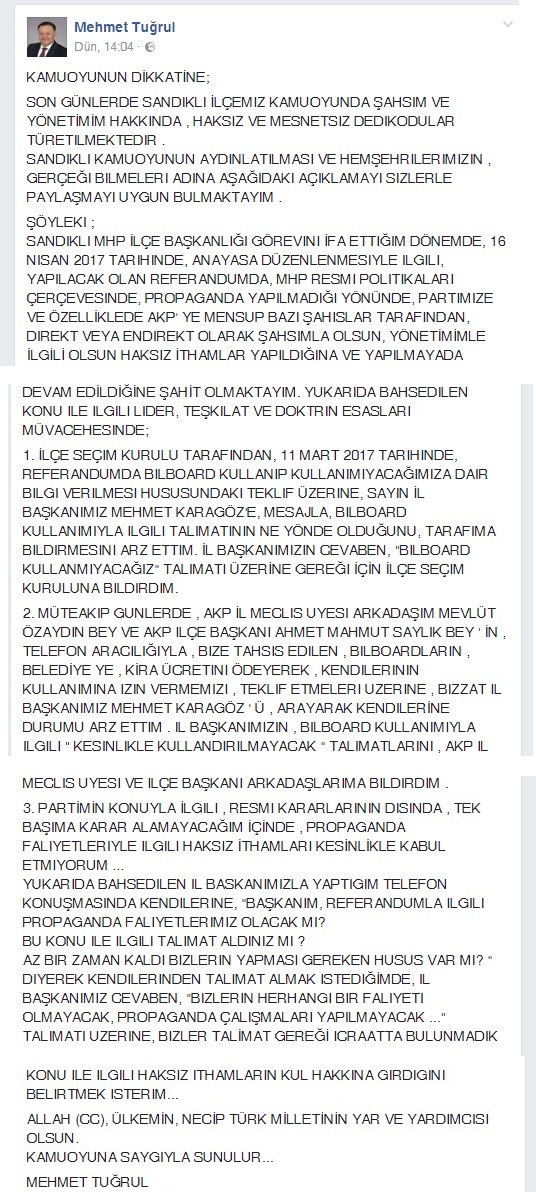 Şöyle ki; Sandıklı MHP ilçe başkanlığı görevini ifa ettiğim dönemde, 16 nisan 2017 tarihinde, anayasa düzenlenmesiyle ilgili, yapılacak olan referandumda, MHP resmi politikaları çerçevesinde, propaganda yapılmadığı yönünde, partimize ve özelliklede AKP'ye mensup bazı şahıslar tarafından, direkt veya endirekt olarak şahsımla olsun, yönetimimle ilgili olsun haksız ithamlar yapıldığına ve yapılmaya da devam edildiğine şahit olmaktayım. Yukarıda bahsedilen konu ile ilgili lider, teşkilat ve doktrin esasları muvacehesinde;