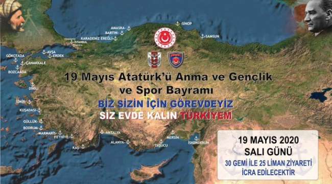Milli Savunma Bakanlığı 19 Mayıs Atatürk'ü Anma Gençlik ve Spor Bayramı kapsamında Deniz Kuvvetleri'ne ait 30 geminin, 25 liman ziyareti gerçekleştireceğini açıkladı.Bakanlığın Twitter hesabından yapılan açıklamada, "19 Mayıs Atatürk'ü Anma ve Gençlik ve Spor Bayramı kapsamında Deniz Kuvvetlerimize ait 30 gemimiz, 25 liman ziyareti icra edecek. Sahile mümkün olan en yakın mesafede demirleyecek olan gemilerimizde gün batımında bayrak töreni ile birlikte İstiklal Marşı okunacaktır" denildi.