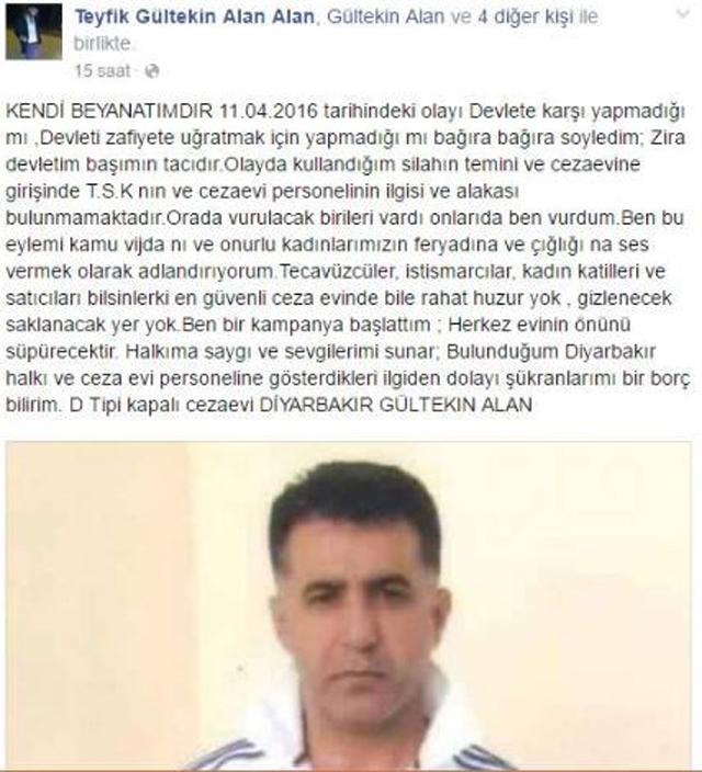 “11 Nisan 2016 tarihindeki olayı devlete karşı yapmadığı mı, devleti zafiyete uğratmak için yapmadığı mı bağıra bağıra söyledim zira devletim başımın tacıdır. Olayda kullandığım silahın temini ve cezaevine girişinde TSK’nın ve cezaevi personelinin ilgisi ve alakası bulunmamaktadır. Orada vurulacak birileri vardı, onları da ben vurdum. Ben bu eylemi kamu vicdanını ve onurlu kadınlarımızın feryadına ve çığlığına ses vermek olarak adlandırıyorum. Tecavüzcüler, istismarcılar, kadın katilleri ve satıcıları bilsinler ki en güvenli cezaevinde bile rahat huzur yok, gizlenecek saklanacak yer yok. Ben bir kampanya başlattım. Herkes evinin önünü süpürecektir. Halkıma saygı ve sevgilerimi sunar, bulunduğum Diyarbakır halkı ve ceza evi personeline gösterdikleri ilgiden dolayı şükranlarımı bir borç bilirim. D Tipi Kapalı Cezaevi Diyarbakır Gültekin Alan.”