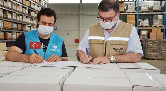 MÜSİAD İzmir tarafından hazırlanan Ramazan kumanyaları MÜSİAD İzmir Başkanı Bilal Saygılı’nın katılımıyla İnsan ve Medeniyet Hareketi İzmir Şb. Bşk. Uğur Bayrak'a teslim edildi. Erzaklar binlerce aileye dağıtılarak Ramazanın bereketi çoğalmış olacak.