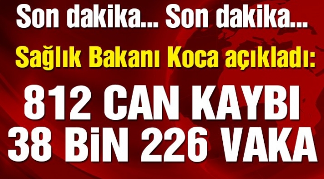 Sağlık Bakanlığı, corona virüsü ile ilgili son dakika gelişmelerini paylaştı. Türkiye Günlük Koronavirüs Tablosu'na göre, toplam vaka sayısı 38 bin 226, toplam hayatını kaybedenlerin sayısı 812'ye yükseldi. Sağlık Bakanı Koca, "Hastalarımızdan 264’ü daha iyileşti. Yoğun bakım ve entübe hasta sayımızdaki artış hızı düşme eğiliminde. Başarımız izolasyona bağlı. Virüs, gücünü temas ortamından alıyor. Virüse bu fırsatı tanımayalım. Evde kalalım" dedi.