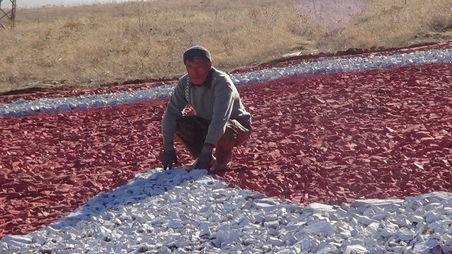 Sandıklı’da yaşayan ve şehit habelerine çok üzülen 62 yaşındaki bir vatandaş, doğal taşlardan dev bir Türk bayrağı yaptı