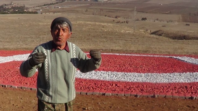 “Dağlıca’da şehit düşen askerlerimizi ve şehit olan polislerimizin haberini duyunca gece boyunca uyuyamadım. Onlar için birşey yapmak istedim. Sabah bu dağa gelerek beyaz karton kutular koydum. Sabah arabayla Sandıklı’ya giderken dağa bakarak kutuların görünüp görünmediğini ve nereden görülebileceğini tespit ettim. İlk önce 192 metrekare aşağı kısma yaptım. Buraya da 210 metrekare bayrağı tek başıma yaptım. Allah bana güç verdi. Şehitlerimiz, gazilerimiz ve Sandıklı’da bulunan Şehit Ahmet Yumak Anaokulundaki çocuklarımız için bunu yaptım.”●iha
