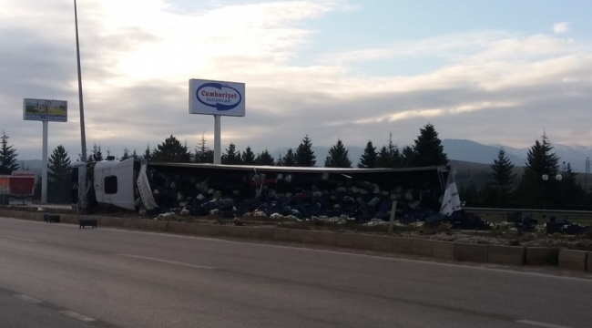 Edinilen bilgilerre göre ,Afyonkarahisar’ın Antalya yol kavşağı cumhuriyet dinlenme tesisleri dönüşünde muz yüklü bir tır virajı alamayarak yan yatarak devrildi.