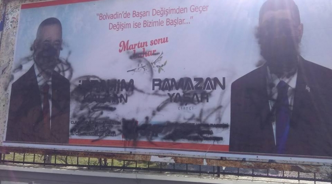Afyonkarahisar’ın Bolvadin ilçesinde CHP Bolvadin İl Genel Meclisi Adayları İbrahim Kalkan ve Ramazan Yaşar’ın bilboardlarda bulunan resimlerine kimliği belirsiz kişi yada kişilerce saldırı düzenlendi.