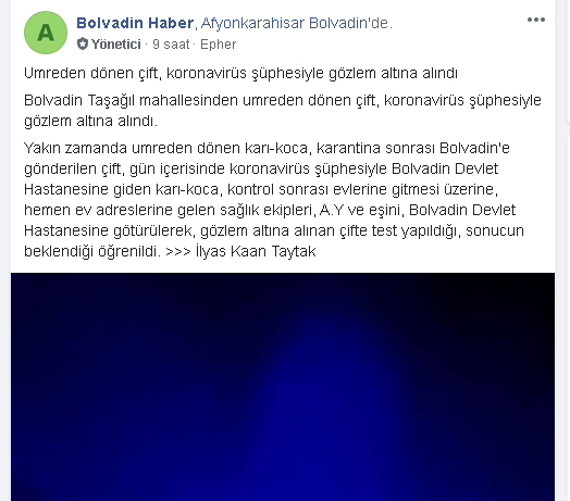 Yakın zamanda umreden dönen karı-koca, karantina sonrası Bolvadin'e gönderildi. Gün içerisinde koronavirüs şüphesiyle Bolvadin Devlet Hastanesine müracaat eden aile, kontrol sonrası evlerine döndükten sonra, hemen ev adreslerine gelen sağlık ekipleri, A.Y ve eşini, Bolvadin Devlet Hastanesine götürülerek, gözlem altına alarak aileye test yapıldığı ve sonucun beklendiği öğrenildi. >>> İlyas Kaan Taytak