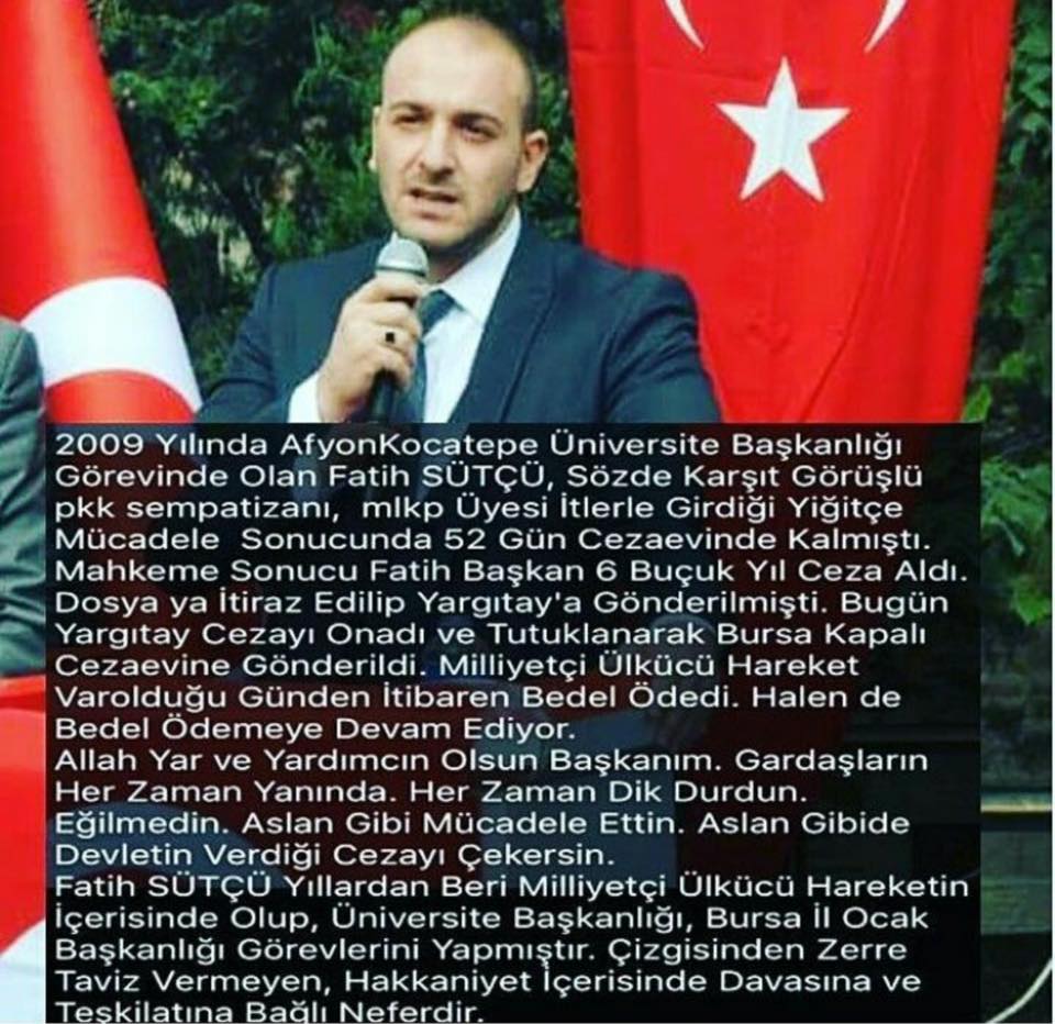 2010-2011 yıllarında Afyon Kocatepe üniversitesi okul başkanlığı görevini yapan Daha sonra Ülkü Ocakları bursa il başkanlığı görevini yerine getiren başarıl başkan Fatih Rüştü Sütcü okuldaki PKK lılarla yapmış olduğu mücadele sonucu 52 gün tutuklu kalmış ve yapılan yargılama sonucu 6,5 yıl ceza almıştı.yargıtayda temyize başvuran Sütçü Yargitayin kararı onamasi üzerine tutuklanarak Bursa Cezaevine gönderildi.