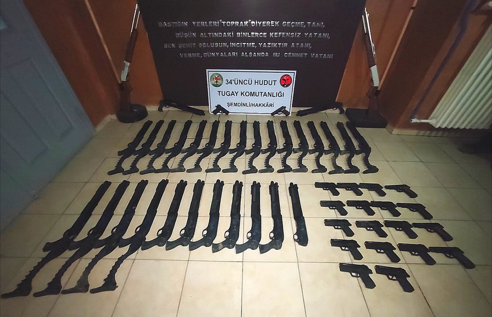 Hakkâri Şemdinli bölgesinde, yasa dışı yollarla hududu geçmeye çalışan 4 şüpheli şahsa bölgede görevli hudut birliklerimiz tarafından müdahale edildi. İcra edilen operasyon sonrasında bölgede yapılan arama-tarama faaliyetinde kaçakçı oldukları değerlendirilen şahıslar tarafından araziye terkedilmiş vaziyette çok sayıda silah ve bunlara ait malzeme ele geçirildi.