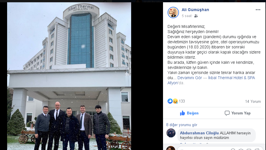 İkbal Termal Otel Genel Müdürü Ali Gümüşhan Sosyal medya hesabından devam eden salgın sebebiyle otel operasyonlarını durdurduklarını açıkladı.
