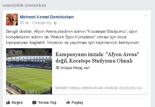 Cumhurbaşkanı Recep Tayyip Erdoğan, ‘Arena’ isminin statlardan kaldırılacağını açıklamasının ardından gözler Afyon Arena Spor Kompleksine çevrildi. Bazı kesimler ise şimdiden spor kompleksine yeni isimler bulmak için anket çalışmalarına başladı