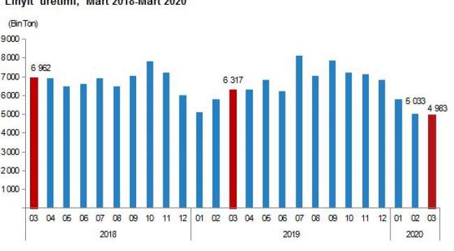 Linyit(1) satılabilir üretimi bir önceki aya göre %1,0, Ocak-Mart döneminde bir önceki yılın aynı dönemine göre %8,2, bir önceki yılın aynı ayına göre %21,1 azaldı.