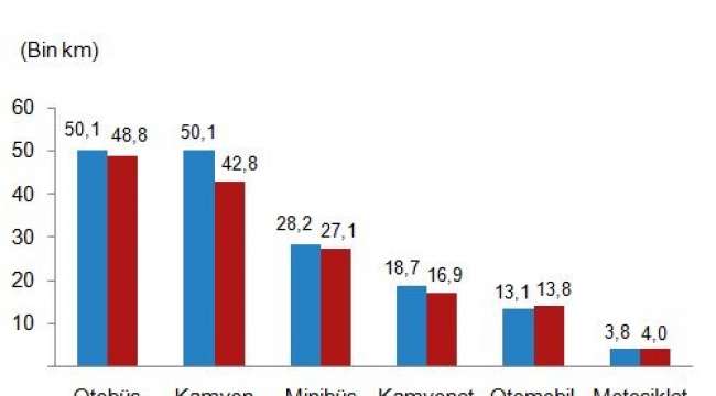 Taşıtların bir yılda yaptıkları ortalama kilometreler incelendiğinde; 2018 yılında sırasıyla otobüslerin 48 bin 826, kamyonların 42 bin 791, minibüslerin 27 bin 77, kamyonetlerin 16 bin 871, otomobillerin 13 bin 776 ve motosikletlerin 3 bin 960 kilometre yaptığı hesaplandı.