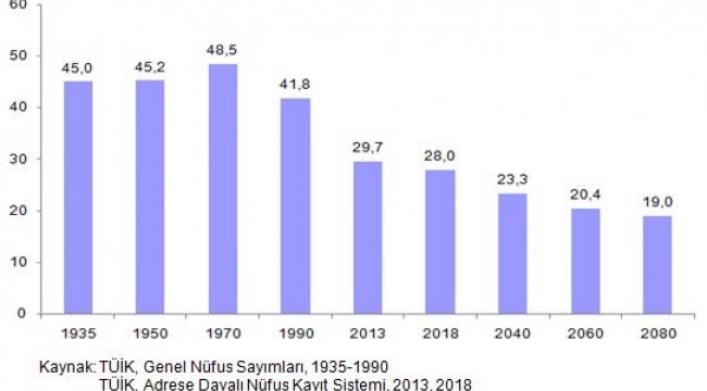 Nüfus projeksiyonlarına göre, çocuk bağımlılık oranının 2023 yılında %33,5, 2050 yılında %28,7 ve 2080 yılında %26,7'ye gerileyeceği öngörüldü.