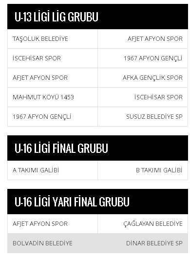 U-16 ligi yarı final grubu maçları yarın oynanacak karşılaşmalar ile tamamlanacak ve Pazar günü bu karşılaşmalarda yenen takımlar şampiyonluk için karşı karşıya gelecekler.U-16 Liginde de Afjet Afyon Spor iddiasını sürdürüyor.