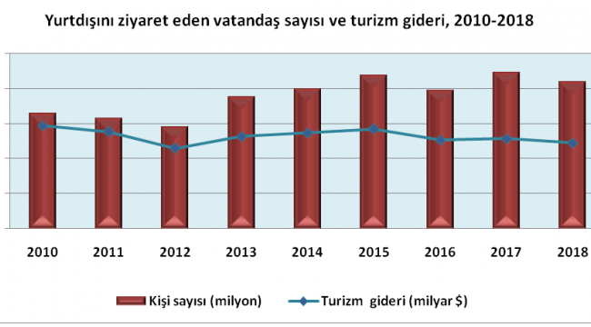 Geçen yıl 8 milyon 383 bin vatandaşımız yurtdışına çıkarak, yabancı ülkelerde toplam 4 milyar 896 milyon dolar turizm harcaması yaptı. Turizm giderinin %80,4'ünü kişisel, %19,6'sını ise paket tur harcamaları oluşturdu.