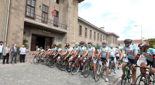 Bisikletçilerin pedal çevireceği Afyonkarahisar-Konya etabı için Valilik binası önünde, uğurlama töreni düzenlendi. Afyonkarahisar Valisi Mustafa Tutulmaz ile Belediye Başkanı Mehmet Zeybek, dün Afyonkarahisar Şehitliklerinden alınan toprağı, 15 Temmuz kahramanı Şehidimiz Ömer Halisdemir'in mezarına konulması için bisikletçilere teslim etti.